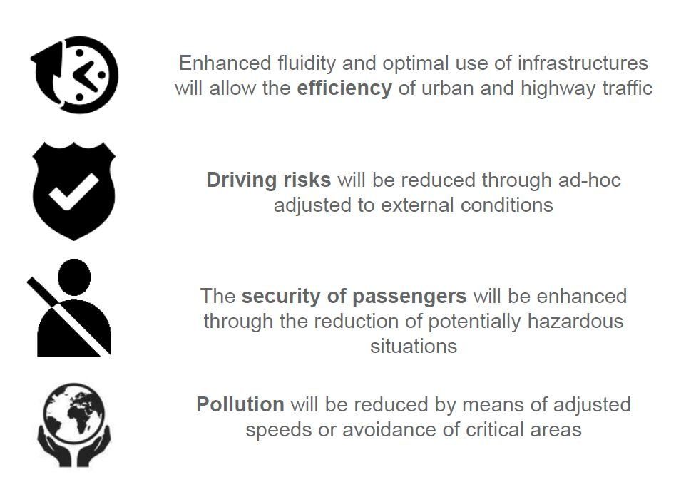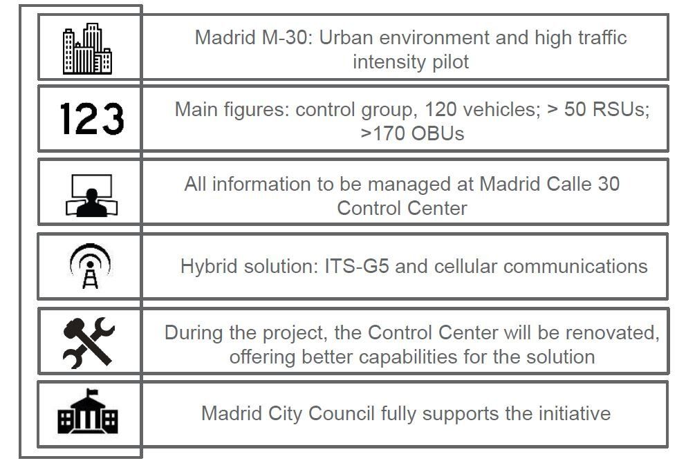 El número estimado de vehículos equipados es de 120. En particular, ITS-G5 se usará los 32 km del piloto Madrid.